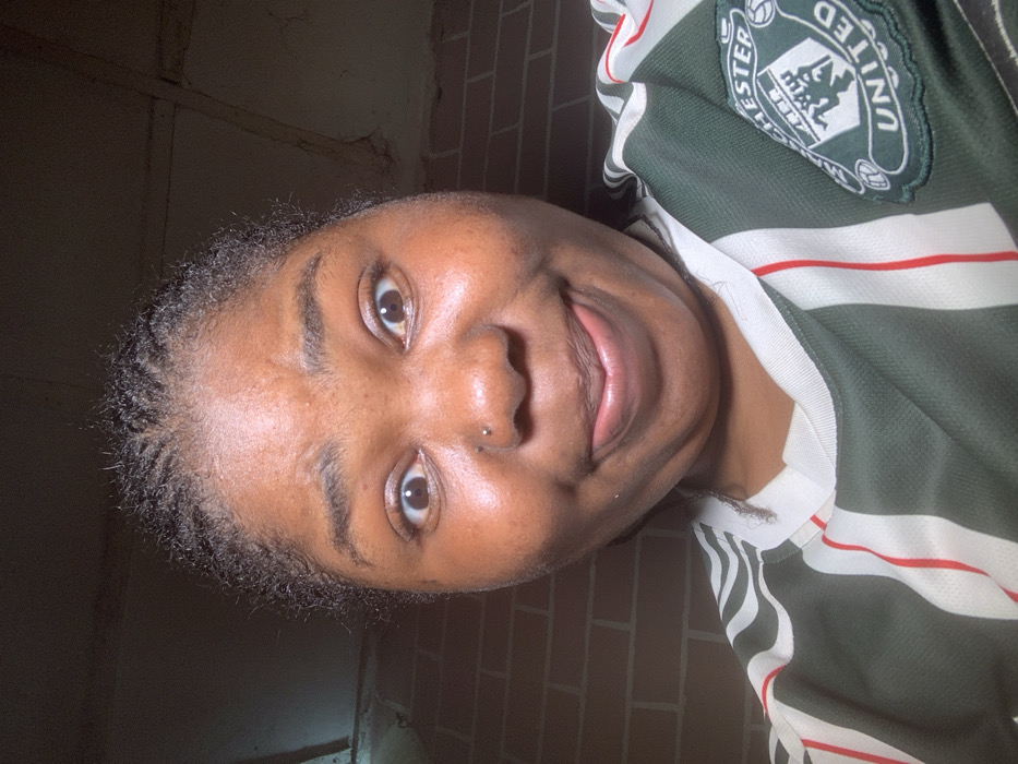 A person smiles at the camera, wearing a green and white striped Manchester United jersey. The person has dark hair and brown eyes, and a nose piercing is visible. A brick wall is behind the person to the right, and a dim, dark wall is behind the person to the left. The image has been rotated.