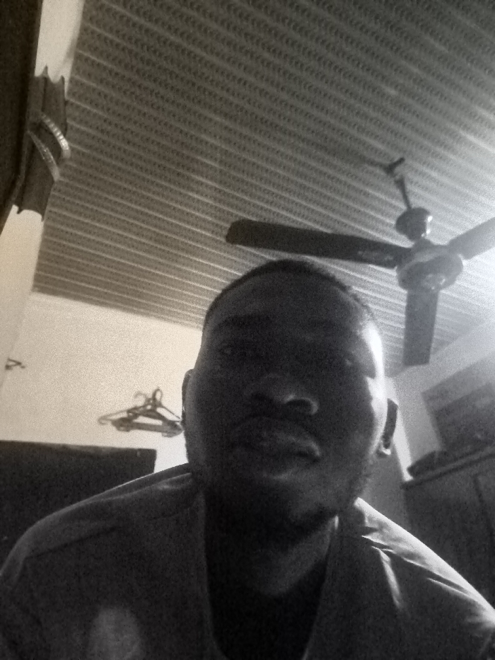 The image displays a low-angle, desaturated indoor scene in Unguwar Gabas, Nigeria. A male individual occupies the lower two-thirds of the frame, facing the camera. His facial features are largely obscured by shadow; he has short hair and a beard. He wears a dark, casual upper garment. The background features a patterned, possibly slatted or corrugated, ceiling. A three-bladed ceiling fan is mounted on the ceiling in the upper right quadrant. A light-toned wall is visible on the left, displaying two wire coat hangers. A dark piece of furniture, possibly a wardrobe, is partially visible on the far right. A decorative item with reflective details is affixed to the upper left wall-ceiling junction. The overall lighting is dim.