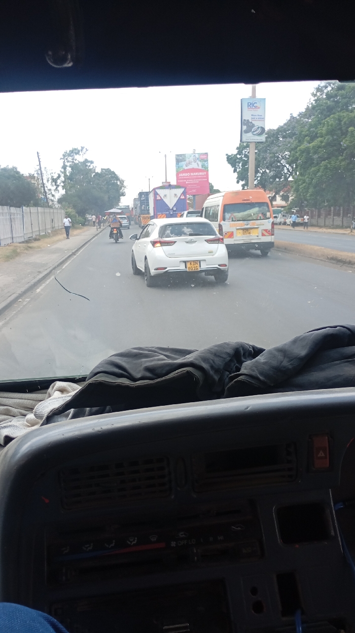 From within a vehicle, the scene shows a road with moderate traffic. A white car with license plate KDN 601G is directly ahead, followed by a small orange and white bus. Pedestrians are walking along the roadside. Billboards are visible in the background, including one for "JAMBO HARUBUT." The sky is overcast, and the vehicle's dashboard and a piece of dark cloth are visible in the foreground, framing the view.