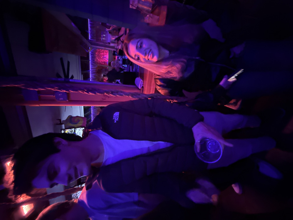 A dimly lit indoor scene reveals a man and a woman. The man, wearing a white shirt and a black jacket, holds a drink. The woman, with long blonde hair, smiles towards the camera while holding a phone. The environment features a rope barrier, along with bar elements such as bottles and decor in the background. The lighting casts a purple and blue hue over the image.