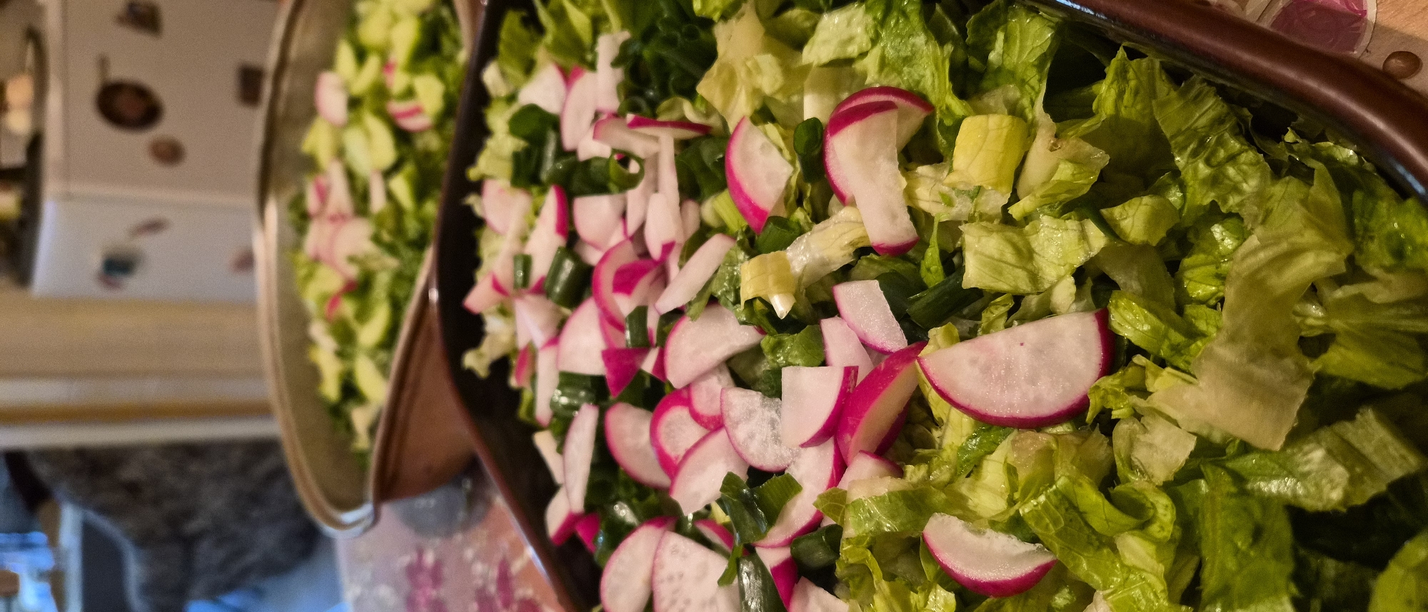 two large bowls of salad. The salads contain chopped lettuce, sliced radishes, and chopped green onions. The bowls appear to be on a counter in a domestic kitchen. The location is not evident in the image.