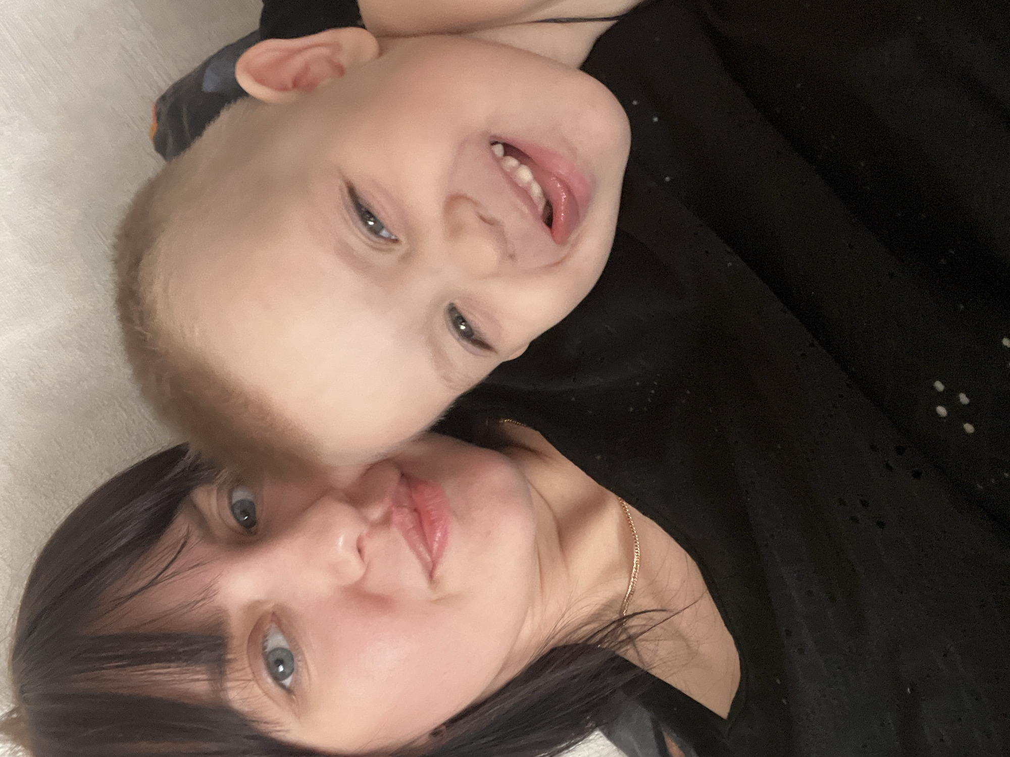 A selfie taken from a low angle in Марковский, Russia, shows a fair-skinned woman with dark hair and light blue eyes lying on her side, with a fair-skinned child, likely her son, lying close to her