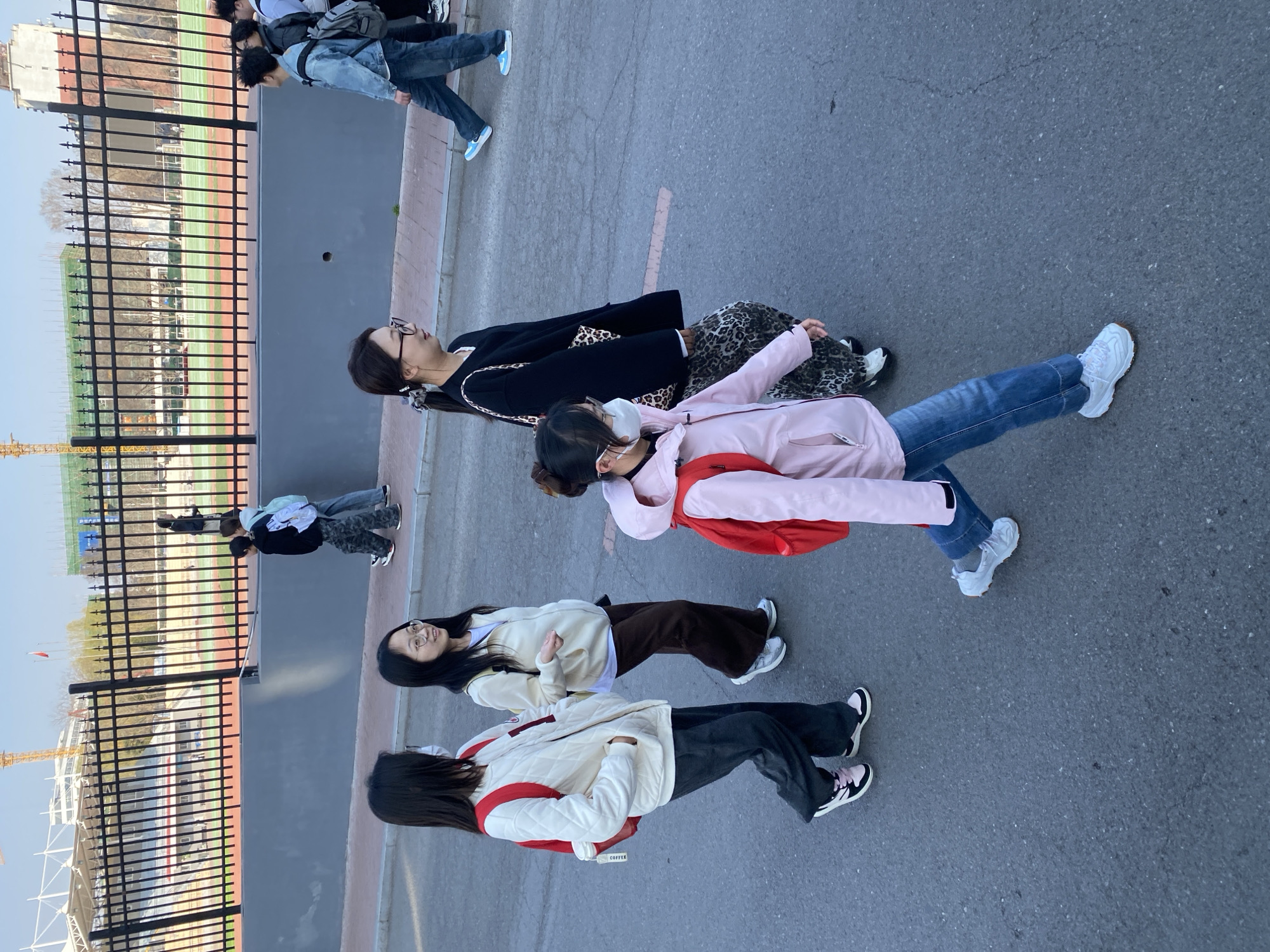 Four young women are lying on the ground in a paved area with a fence and a sports field visible in the background. The woman closest to the camera wears a white jacket with red straps, dark pants, and black and pink sneakers. The next woman is wearing a light-colored jacket, brown pants, and white sneakers. The third woman is wearing a pink coat, blue jeans, and white sneakers with a red backpack. The fourth woman is wearing a black sweater and leopard print pants. All four women are wearing glasses. Other people are walking in the background. A construction crane is visible in the background behind the fence. The scene is in Zhongtun, China, as the text indicates.