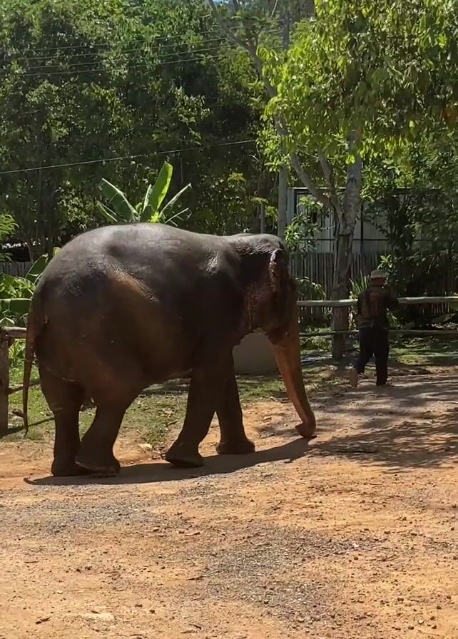 n elephant walking on a dirt path in an outdoor environment. The elephant is gray-brown and walking away from the camera. A man with a hat is walking on a path beside the elephant, separated by a wooden fence. The background shows lush green trees and foliage, suggesting a tropical or semi-tropical location. The sky is clear and blue. The environment appears to be a sanctuary or protected area for elephants.