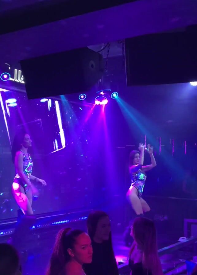 scene inside a nightclub. Two female dancers wearing colorful bodysuits and knee-high boots perform on a raised platform, with a large LED screen displaying abstract graphics behind them. The club is dimly lit with purple and blue lighting effects. In front of the stage, a crowd of people, mostly young adults, are watching the performance, some holding drinks. The scene suggests an energetic and lively atmosphere typical of a nightclub environment.