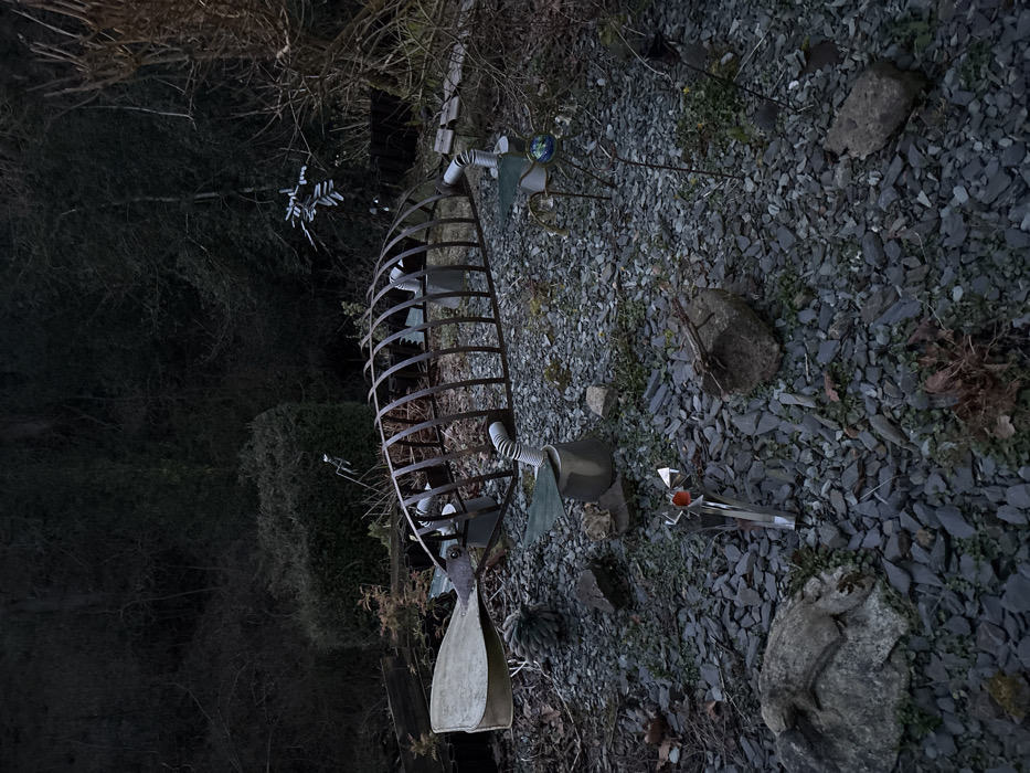 The image displays an outdoor sculptural garden in Minsterley, United Kingdom, under dim ambient light. The ground is covered with dark grey slate chips, small stones, and sparse green vegetation. Central to the scene is an elongated sculpture resembling a fish skeleton, constructed from rusted metal bars, featuring a flat, light-colored tail section and a discernible eye. White corrugated pipes and green flat objects are arranged within its interior, connecting to supporting metal cylinders from which more corrugated pipes emerge. In the left foreground, a grey rock supports a lizard figurine. A shiny, angular metal sculpture with a red center is embedded in the ground in the immediate foreground. To the right, a metal stand holds a blue and green glass orb. The background consists of dense, dark green foliage, including a trimmed hedge and numerous trees, with additional smaller, abstract metal sculptures interspersed throughout the vegetation. No individuals are present in the scene.