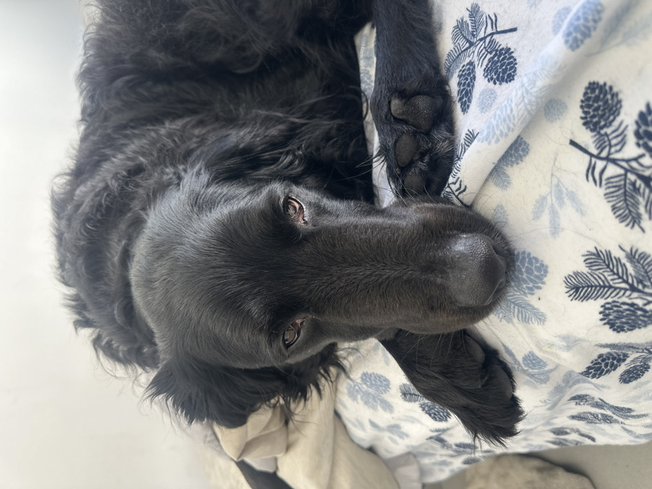 - "A black dog, likely a Flat-Coated Retriever, rests on patterned bedding" by FM-xViYI2, licensed under CC BY 4.0