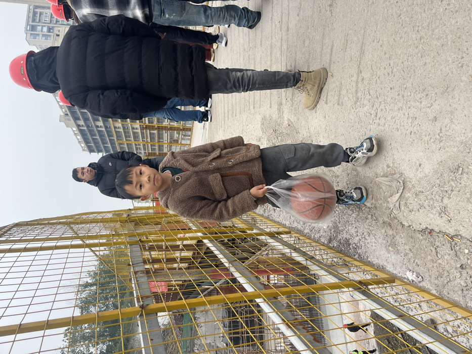 A young boy in a brown jacket holds a basketball in a plastic bag. He stands on a gray surface with a yellow metal fence to his left. In the background, several people are walking, some wearing hard hats. A building is visible behind them. The scene seems to be a construction site or an area near one. The weather appears overcast.
