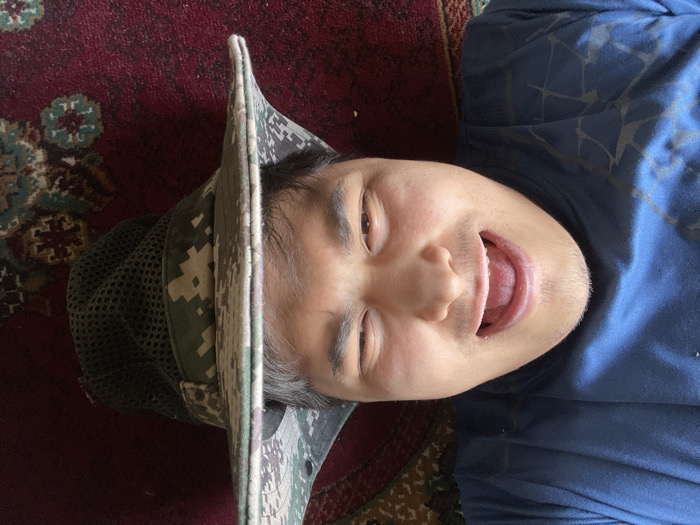 A single individual is observed from an overhead perspective, lying on a patterned red rug within the city of Mirzabashichek, Uzbekistan. The subject, a male with medium complexion, dark hair, and dark eyes, wears a blue t-shirt with a subtle geometric pattern and a digital camouflage boonie hat featuring a mesh crown. He is positioned horizontally, with his head turned towards the camera, mouth open, tongue partially visible, displaying a wide smile. The underlying rug is crimson-toned with traditional floral and geometric designs in blue-green and light beige.