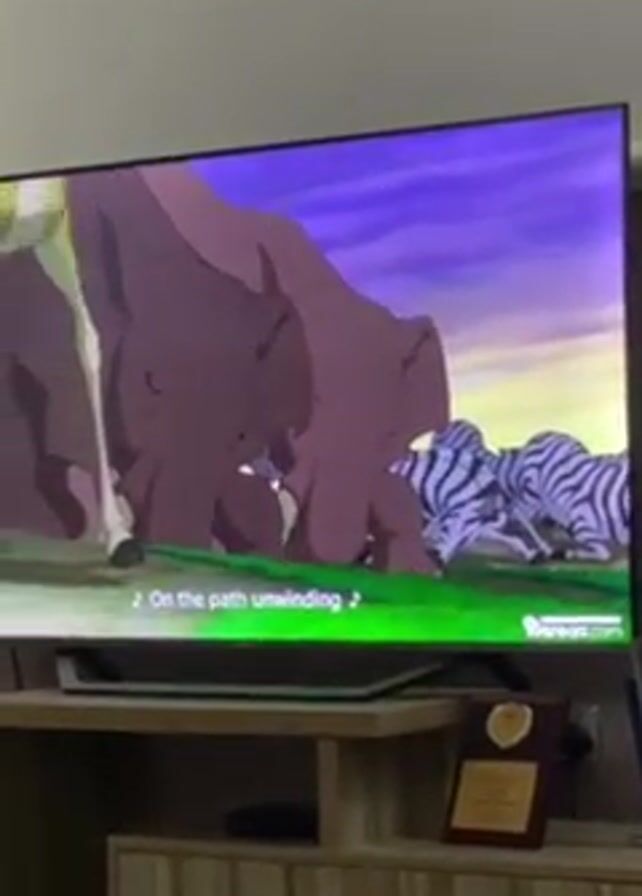 The video depicts a scene from the animated movie "The Lion King" being played on a flat-screen television set. The initial view features animated giraffes, an elephant, and zebras in a savanna-like setting, with lyrics displayed on the screen. The scene then transitions to show Simba and Mufasa on Pride Rock, also with lyrics appearing on the screen. The TV is mounted on a wooden TV stand in what seems to be an indoor setting. A gold-colored award or plaque sits beside the TV, also on the stand.
