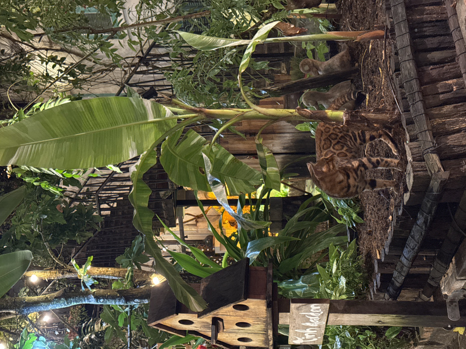 The image depicts a nighttime garden scene in Tịnh Garden, Phú Quốc, Vietnam. In the foreground, a domestic cat, likely a Bengal breed, with distinct brown and black rosette markings, stands on a dark mulch bed. Its head is turned to the left, observing something out of frame. To the left of the cat, a multi-tiered wooden birdhouse with circular entry holes is mounted on a wooden post. Below the birdhouse, a rectangular wooden sign reads "Tịnh Garden" in white script. Various tropical plants, including a prominent variegated banana plant with green and pale green leaves, fill the scene. The mulch bed is bordered by a low, rustic fence constructed from dark wooden logs. To the right of the cat, within the mulch bed, are several grey, weathered, abstract figures resembling seated human forms. In the midground and background, dense green foliage, trees, and shrubs are visible. String lights with warm illumination are strung through the upper left section of the trees. A black metal spiral staircase is visible through the vegetation in the upper midground. Portions of a building facade, including wooden elements and a light-colored wall, are discernible behind the foliage, with warm orange-yellow light emanating from interior spaces. The entire scene is illuminated by artificial lighting. No human figures are present.