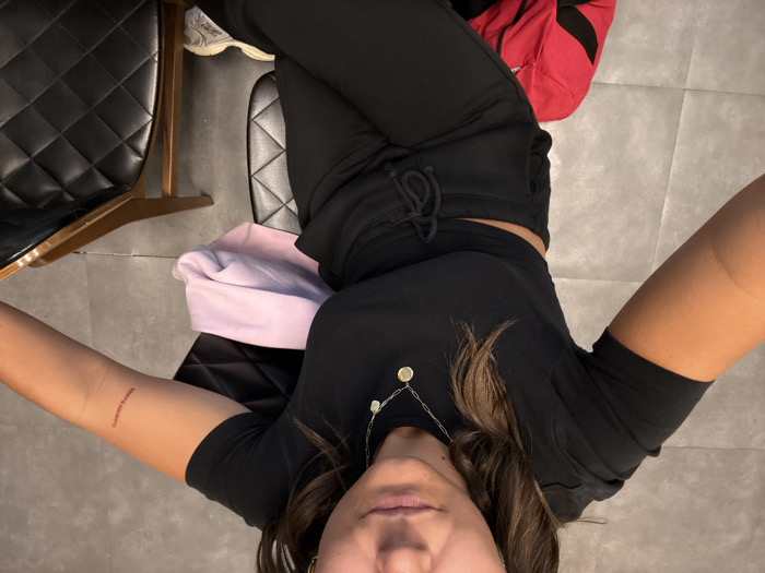 The image depicts a female individual captured in a high-angle, downward-looking self-portrait, taken indoors in Arnavutköy, Turkey. The subject, with brown hair, is wearing a black short-sleeved crop top and black sweatpants with a visible drawstring. She is adorned with a silver-colored chain necklace featuring two small pendants. A red text tattoo is visible on her right forearm. Partially visible on her right foot is a white and silver athletic shoe. The floor is composed of light grey square tiles. Two chairs are present in the scene: one to the right, constructed with a wooden frame and black quilted upholstery, and another partially visible to the left, also featuring black quilted upholstery. A light pink folded garment rests on the back of the left chair, and a red and black item is partially visible on the floor beneath the subject's left leg.