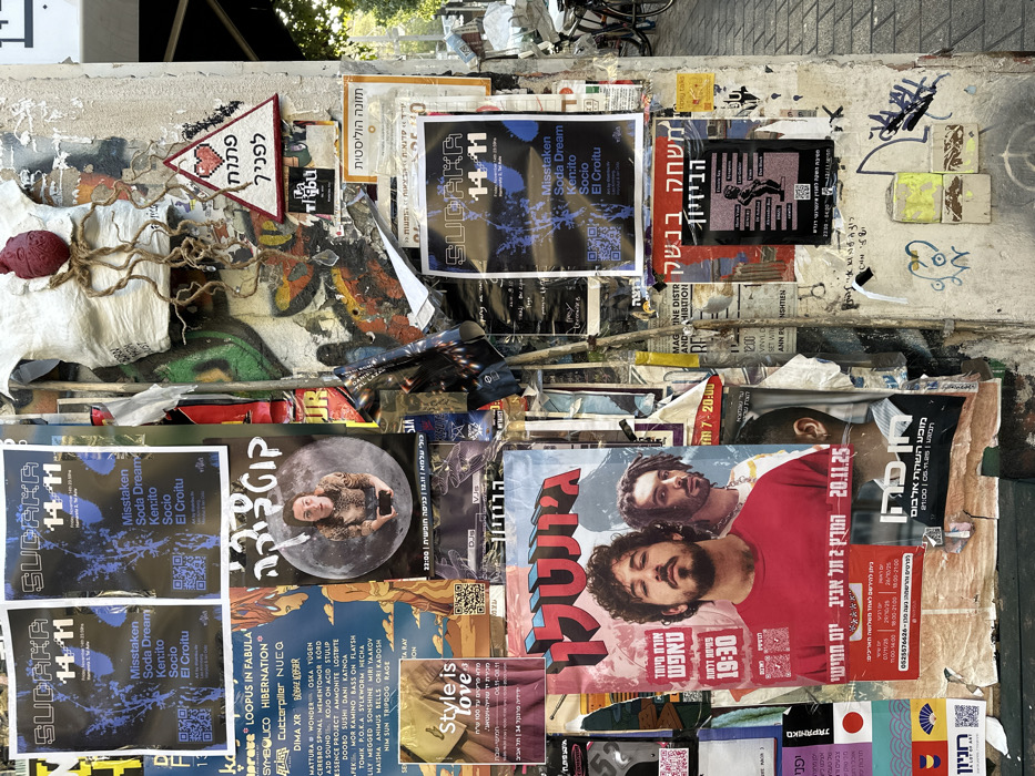 The image depicts a wall plastered with various event posters and graffiti. Many feature musical acts with names like "Sudaka," "GIP," and "VOT GAUELE," with performance dates in November. Hebrew text is prominent, alongside images of musicians and abstract designs. There are also snippets of printed articles and various textured elements adding to the wall's layered and chaotic appearance. A knitted triangular sign with a heart is visible alongside other miscellaneous scraps and tags.
