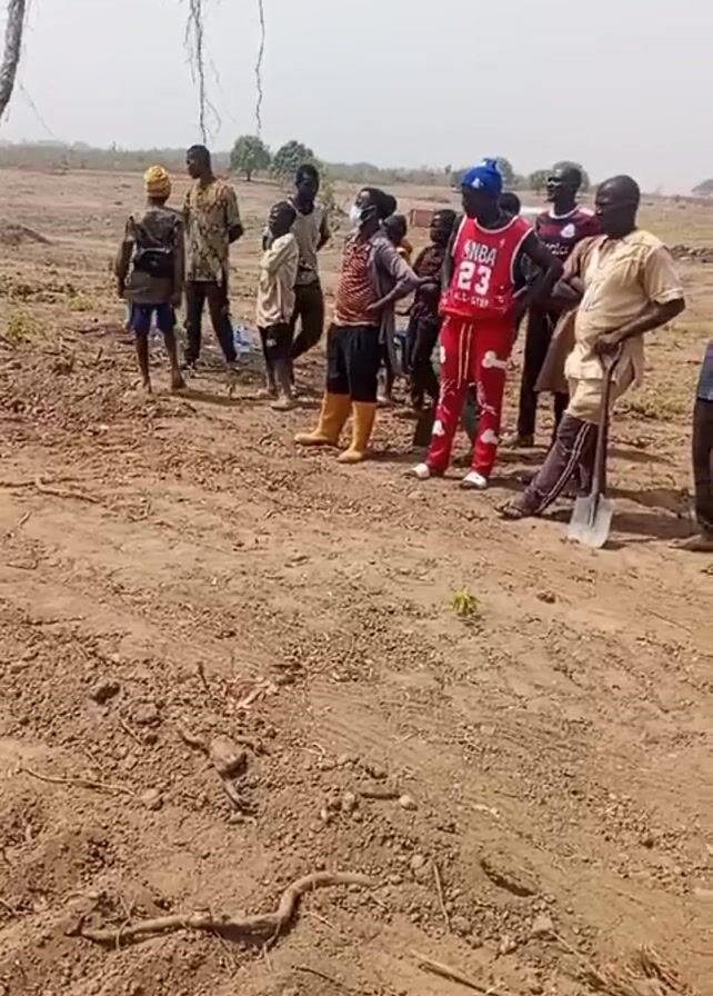A group of about ten individuals of varying ages are standing on a vast, dry, and open field of dirt and small roots. The sky is overcast and bright, but without direct sunlight. One man is wearing a bright red NBA jersey and pants. Another man is leaning on a shovel. The group seems to be congregated together. In the distance, a few scattered trees can be seen.