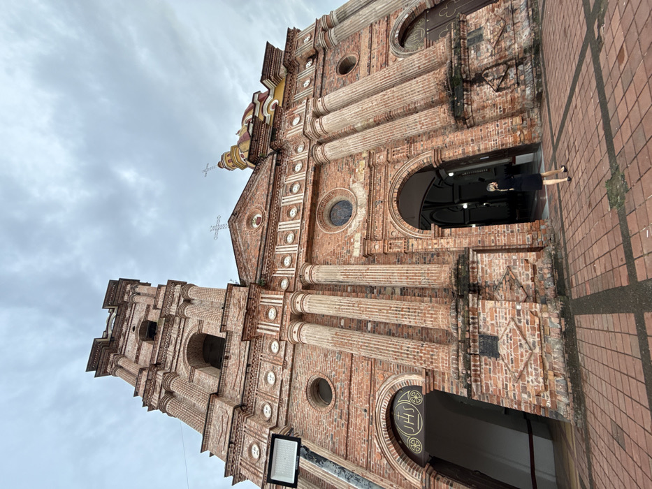 A brick church stands prominently with two towers and ornate details. The facade features decorative columns, arched windows, and crosses. A person stands in the doorway of the church. The sky is overcast. A brick-paved surface extends from the base of the building.