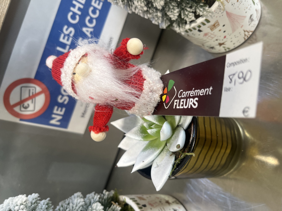 A close-up image depicts a retail display in Aiguilhe, France, featuring festive and botanical items on a reflective surface. The central subject is a small decorative Santa Claus figurine, approximately 10-12 cm tall, characterized by a red knitted pointed hat with a white pom-pom and trim, a fluffy white beard, a small beige nose, a red knitted body with white trim, and small wooden hands and feet. This Santa figurine is positioned atop a vertical retail price tag. The tag's upper section is dark red, displaying a multicolored logo and the text "Carrement FLEURS." The lower, white portion of the tag shows "Vase:" and "Compositions: €7.90" printed in black, indicating a price. To the left of the Santa figure, a succulent plant with pale green-white, fleshy, rosetted leaves, possibly an Echeveria, is contained within a small dark pot adorned with horizontal golden stripes. A minimal amount of green moss is visible on the soil surface. Further to the left and partially cropped from the frame is a small artificial Christmas tree, flocked with white "snow," planted in a light-colored pot decorated with subtle, light-toned patterns resembling houses and trees. The entire arrangement rests on a highly reflective, light-colored metallic surface, consistent with a display counter, which shows blurred reflections of the objects. In the blurred background, a blue sign with a white border is visible. The sign prominently features a red circle with a diagonal line over a Euro currency symbol combined with a credit card icon, indicating that credit cards are not accepted. Partially visible French text below reads "NE SONT PAS LES CHÈQUES ACCEPTÉS" (Checks are not accepted) and "Merci de votre compréhension" (Thank you for your understanding).
