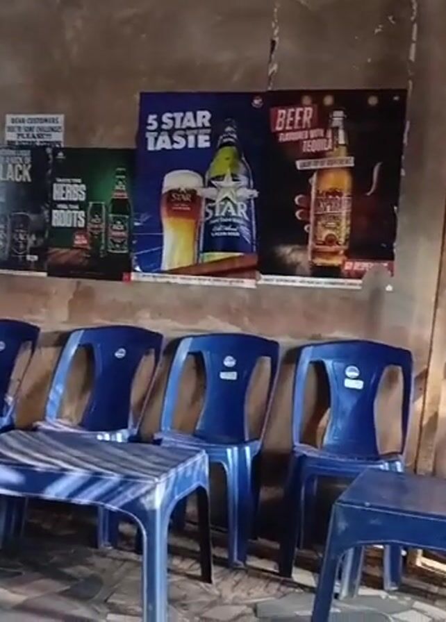 interior of an outdoor bar or restaurant area. There are three small, blue plastic tables and eight blue plastic chairs arranged around them. The tables and chairs are set up against a wall with multiple posters advertising alcoholic beverages, including brands like Star. The walls appear to be aged and slightly worn. The lighting suggests it is daytime, and shadows indicate a light source from the left side of the frame. Background music is playing.