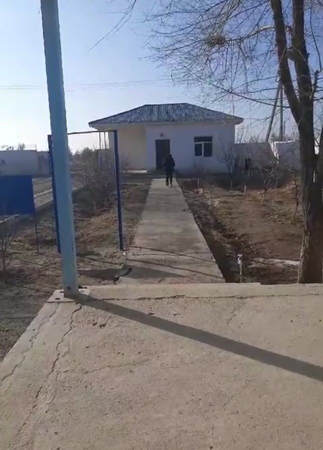 view of a one-story white building with a dark gray roof under a clear blue sky. The building has a single window visible to the right of the front door. A person dressed in dark clothing is walking along a concrete path leading towards the building's entrance. The path is flanked by dry, barren land with sparse vegetation and small, leafless trees. In the foreground, a concrete slab is partially visible, along with a light blue metal post and a portion of a roof overhang. A tall, bare tree stands to the right side of the frame, its branches reaching towards the sky. Power lines are faintly visible in the background. The scene appears to be in a rural or undeveloped area, likely during the late fall or winter.