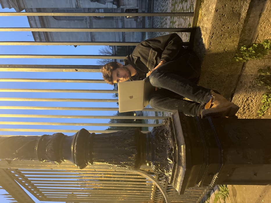 - "A young male individual is seated on a low stone wall at dusk, utilizing a silver Apple MacBook laptop, in Paris, France" by FM-mCUyD3, licensed under CC BY 4.0