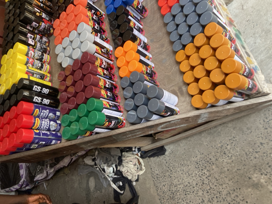 In Satellite Town, Nigeria, the image presents a ground-level, slightly downward-angled view of a retail display primarily consisting of numerous aerosol cans. The cans are neatly arranged in multiple horizontal rows on multi-tiered wooden shelves constructed from rough-hewn planks. **Objects:** The display features an estimated 10-12 rows of cylindrical aerosol cans. * The top tier includes rows of red cans (labeled "Supreme Carb & Choke Cleaner"), black cans (labeled "GS-90"), and yellow cans (some labeled "Dashboard Polish"). * The second tier displays rows of green cans (labeled "A Super Spray Paint"), maroon cans (labeled "A Super Spray Paint"), light grey cans, and orange cans. * The third tier contains rows of dark grey cans, additional orange cans, black cans, and blue cans. * The bottom visible tier consists of rows of orange and grey cans. The labels indicate products such as carb and choke cleaner, dashboard polish, and spray paints of various colors. The wooden shelving is unpainted and shows minor wear. The ground surface to the left of the display is speckled grey concrete. On this concrete, a pile of textile items, resembling bundled clothing or rags, is visible. **People:** A partial view of a dark-skinned human right hand and forearm is visible in the upper left quadrant of the frame, positioned near the top red cans and above the textile pile on the ground. No distinct actions or interactions are fully captured beyond the implied presence of a person in proximity to the merchandise. **Environment:** The scene depicts an informal retail setup, likely outdoors or in a covered market stall, given the simple construction of the display and the concrete ground.