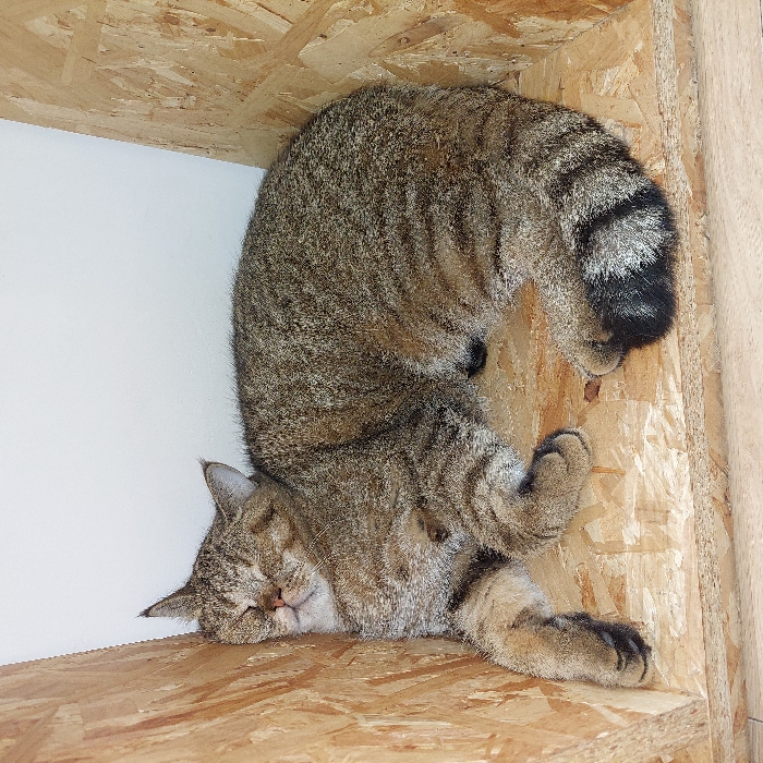 tabby cat sleeping on a wooden shelf, curled into a ball