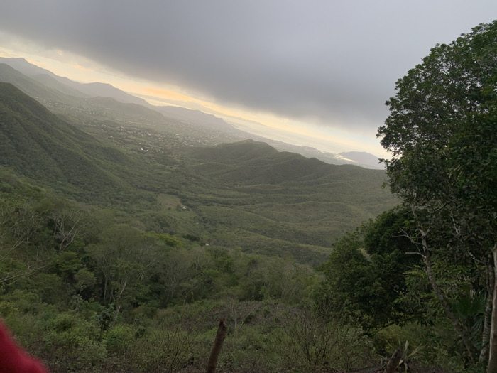 A mountainous, green valley stretches towards the coastline under a cloudy, overcast sky. Hazy sunlight filters through the clouds near the horizon. Dense foliage covers the foreground and midground hills. In the distance, a town nestles between the mountains and the sea. The landscape is lush and verdant.