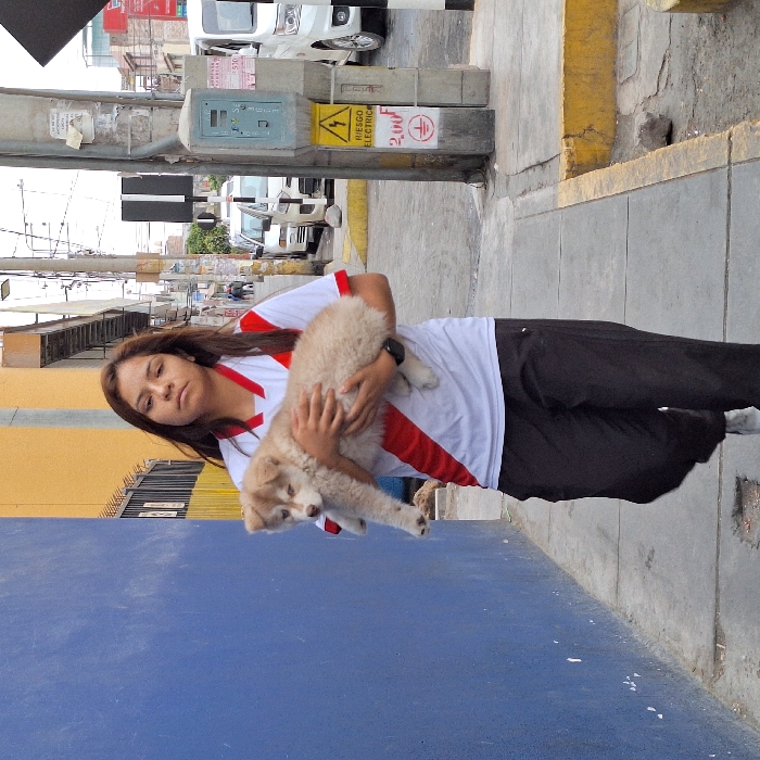 A young woman stands on a sidewalk holding a light-colored husky puppy. She wears a white shirt with a red stripe and black pants. The puppy is nestled in her arms. A utility pole is behind them on the sidewalk, with signs in Spanish. A blue wall is visible on the left, and cars are parked in the background. The scene is outdoors during daylight.