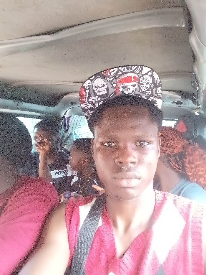 The image captures the interior of a multi-passenger vehicle, presumably in transit within the city of Orifite, Nigeria. A young Black male is prominently featured in the foreground, facing the camera with a neutral expression. He wears a dark-brimmed baseball cap adorned with white, grey, and red skull patterns, and a red and white argyle-patterned sleeveless sweater vest. A dark strap is visible across his right shoulder. Behind him, another young Black male in a black t-shirt with a white "NERD" logo is partially visible, with his right hand raised near his face. To the right of the individual in the "NERD" shirt, a younger person wearing a dark shirt and a visible gold-colored necklace looks towards the left. Further to the right, an individual with reddish-brown braided hair is partially visible, facing away from the camera. To the immediate left of the foreground subject, a person's shoulder covered in a red garment is visible. The vehicle's light-colored ceiling is visible at the top of the frame, indicating an enclosed space.