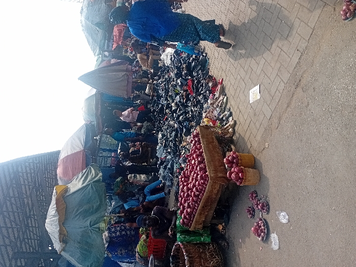 The image portrays an active outdoor market scene situated in Ebute-Metta, Nigeria, under bright daylight