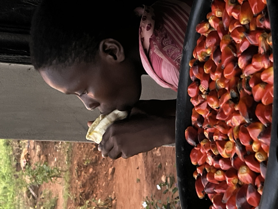 An individual is seen in profile, head bowed, eating a wrapped food item. The person wears a pink and striped garment. Adjacent to them is a black container filled with numerous reddish-brown fruits or seeds. The scene appears to be outdoors, with a glimpse of reddish soil and vegetation visible in the background. The image is oriented vertically.