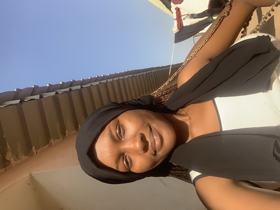 A smiling woman with tanned skin wears a black headscarf. Her brown and blonde braids are visible. She wears a white top and a black cardigan-like garment. A delicate gold necklace rests on her collarbone. The background includes a corrugated metal roof, a light blue sky, and a blurry white and red fabric. The photo is taken from a slightly low angle, with sunlight casting shadows on the woman's face and surroundings.