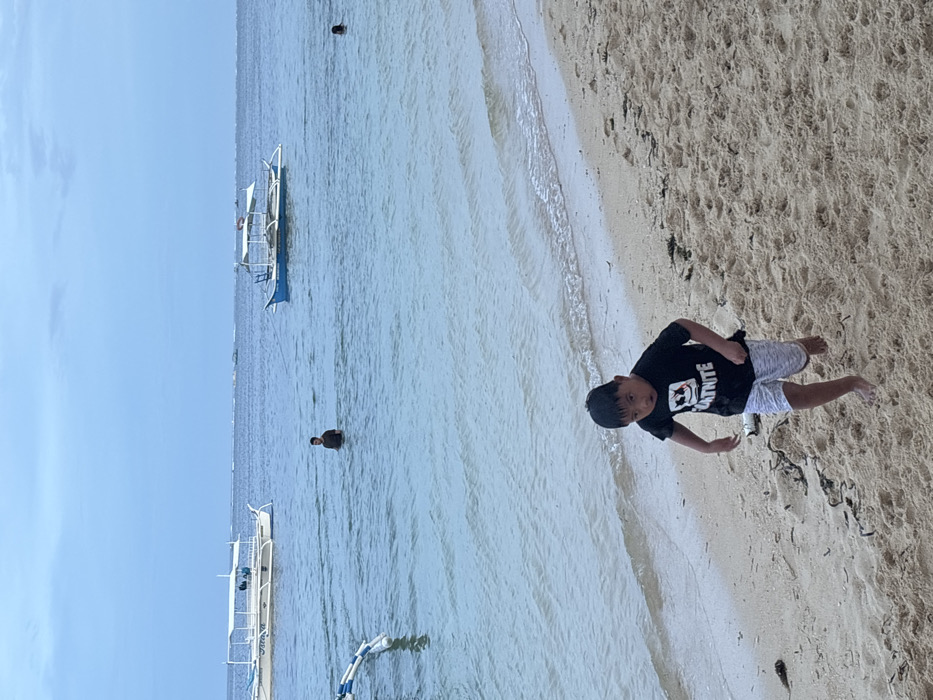The image depicts a beach scene in General Luna, Philippines, under an overcast sky. In the foreground, a young barefoot boy, approximately 5-7 years old, wearing a black t-shirt with a white Marshmello/Fortnite graphic and patterned grey shorts, runs towards the left on light-colored sand near the waterline. The sand shows ripples and scattered dark organic debris. In the midground, the clear, calm sea features two traditional Filipino outrigger boats (bancas) anchored: a larger white boat with a white canopy on the left, and a smaller blue boat with a white canopy on the right. Three individuals are present in the water: one adult male standing chest-deep to the left, and two others partially visible further right and in the far distance, appearing to be wading or swimming. The background shows the expansive sea meeting a light blue-grey sky.