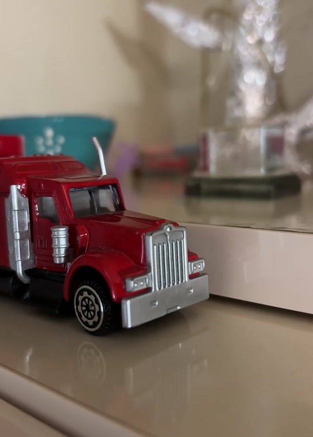 toy Coca-Cola truck sitting on a shelf. The truck is red with silver accents. It has a Coca-Cola logo on the side. The shelf is made of a light-colored material. In the background, there are other objects, including a glass ornament.