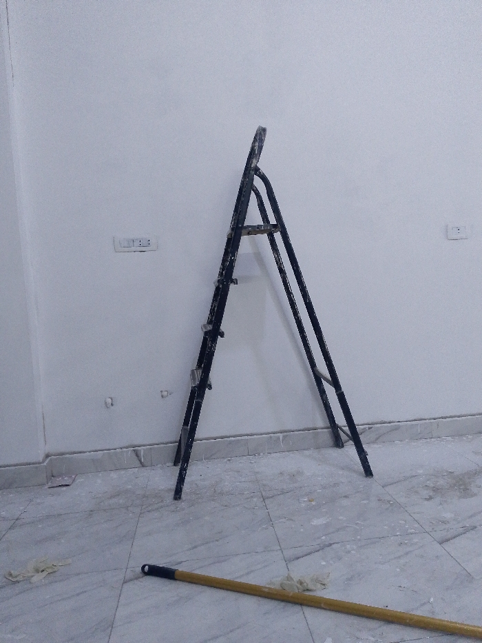 The image displays an interior room in Ma'raba, Syria, with white-painted walls and a light-colored tiled floor. A black, metal A-frame stepladder is positioned upright in the mid-ground, slightly right of center. White paint or plaster splatters are visible on the stepladder's frame and on the light grey and white patterned floor tiles. A light switch/outlet plate is mounted on the left wall, with two smaller circular holes below it. A single electrical outlet is visible on the right wall. A light-colored baseboard runs along the bottom of the walls. In the foreground, a yellow-brown pole with a black end cap lies horizontally on the floor. Two crumpled, off-white objects, resembling rags or discarded gloves, are also present on the floor, one in the bottom-left and another near the pole. No individuals are present in the scene.