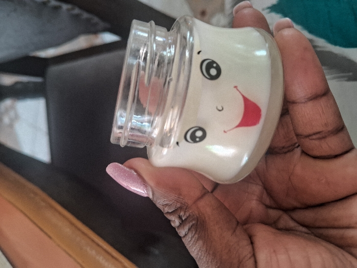 An individual's dark-skinned hand is shown holding a small, clear glass jar in an indoor setting within Muthambi ward, Kenya. The hand displays an elongated, pointed, glittery pink artificial nail on the index finger. The jar, which is approximately half-filled with a translucent, off-white substance, features a cartoon-style face printed on its front, consisting of black circular eyes, small black eyebrows, a black 'C' shape representing a nose, and a wide red smiling mouth with a visible tongue. The jar's top has a threaded rim. The background is blurred, revealing segments of what appears to be a light brown wooden surface, a dark piece of furniture (possibly a chair), and a patterned fabric in teal and white.