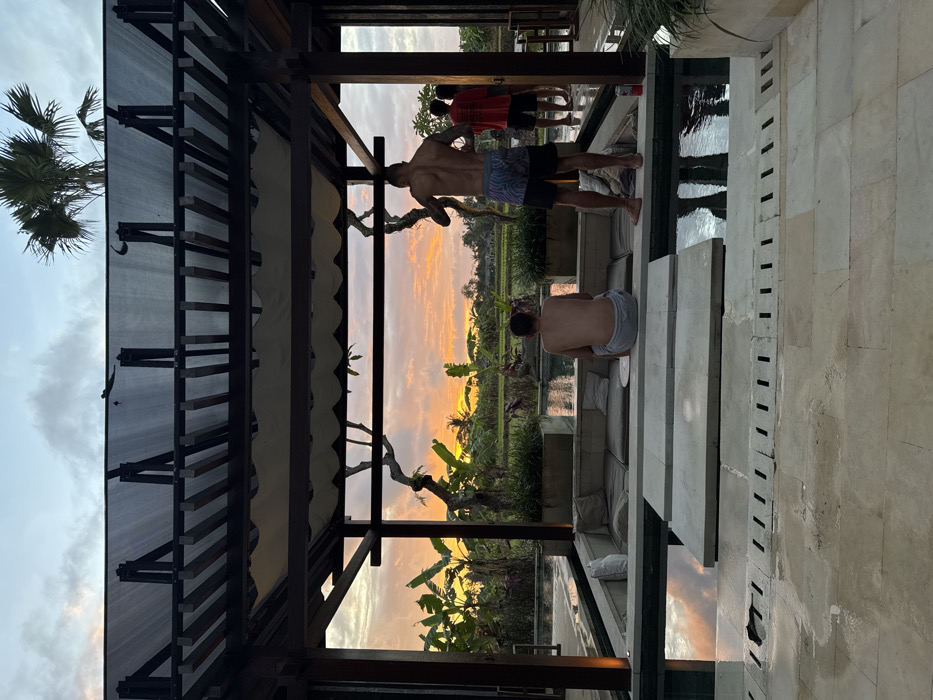 An outdoor, open-air pavilion in Mas, Indonesia, is observed during sunset. The structure features dark wooden beams, a slatted roof partially covered by a translucent mesh, and a retractable white canopy. Below, a sunken lounge area with light-colored cushions is integrated into a multi-tiered swimming pool or water feature. In the midground, a shirtless male, wearing light grey shorts, sits with his back to the viewer on a cushion in the sunken lounge, facing the vibrant orange and yellow sunset sky over distant green rice paddies and dense tropical foliage, including banana trees. To his right, another shirtless male, muscular and tattooed on his back and arms, stands barefoot on a ledge adjacent to the pool, wearing patterned swim shorts. His right arm is slightly raised. A red and white beverage can rests on the ledge near his feet. In the background, two additional individuals, mostly obscured and wearing red shirts, stand near another part of the structure, partially visible behind the standing man. The water reflects the colorful sky. The immediate foreground shows light-colored tiled flooring with drainage grates. A large palm tree is visible against the sky in the upper right.