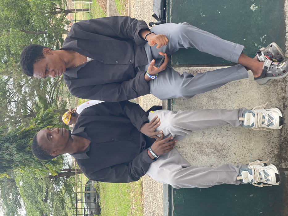 Two young Black males are seated on a concrete barrier in an outdoor setting in Uturu, Nigeria