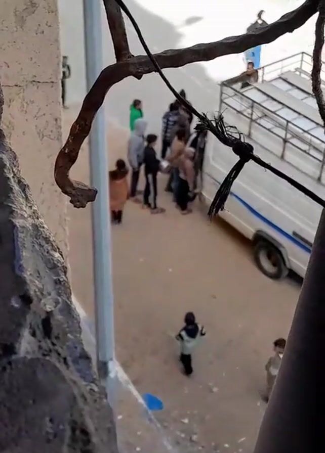 From a high vantage point, the video shows a group of people gathered around the open back of a white van. The van is parked on a dirt road. Several individuals are standing near the van, while one or two appear to be getting in or out. A child is standing in the center of the group, facing the camera. The scene is partially obscured by tree branches and a window frame.