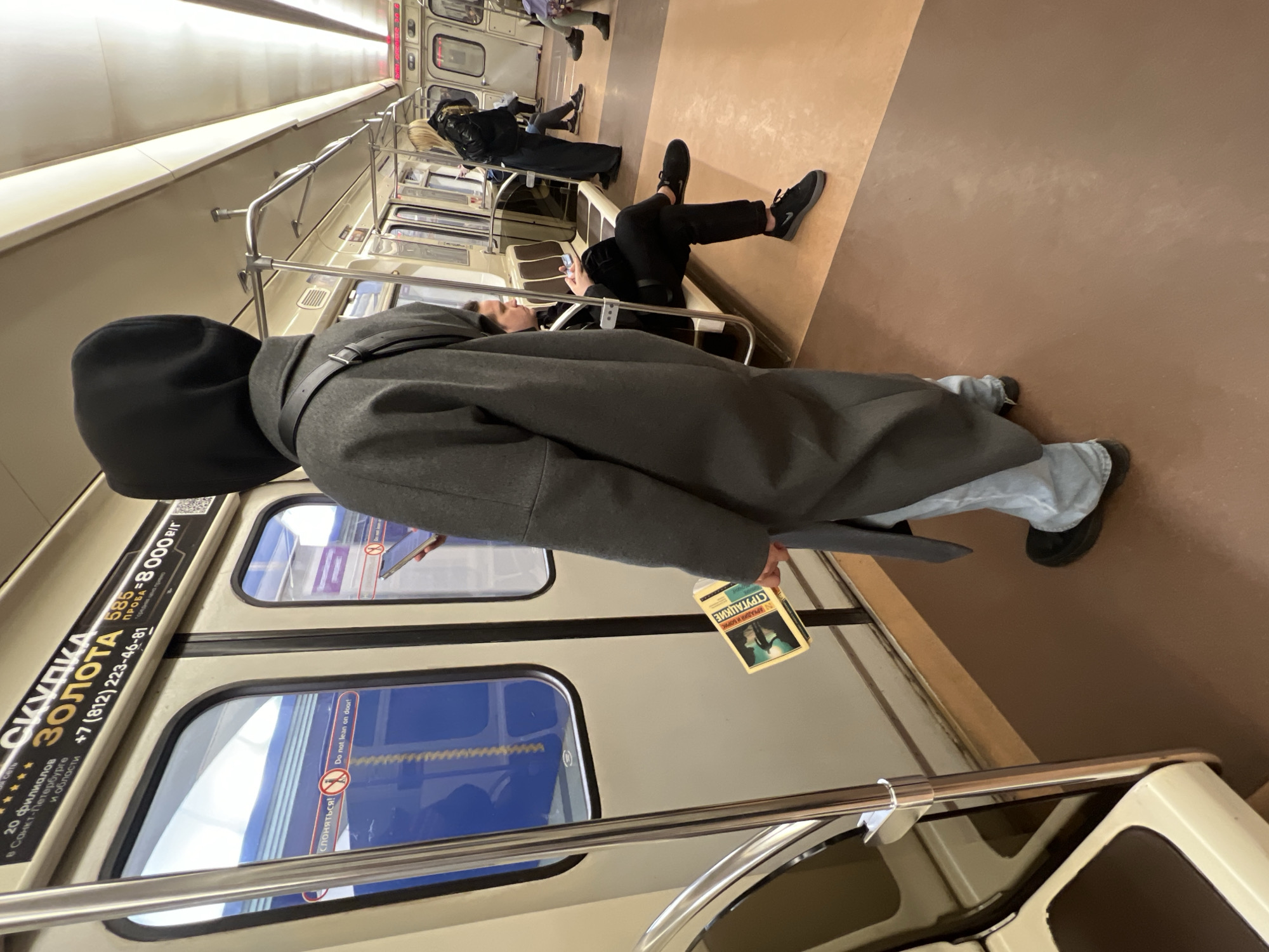 The image captures the interior of a subway car in the Saint Petersburg Metro, Russia, on a line serving Shushary. The primary subject is a person standing in the foreground, viewed from behind, wearing a black hoodie, a long gray overcoat, light blue jeans, and dark shoes. This individual holds a yellow-covered book titled "СТАЛКЕР" (STALKER) in Cyrillic in their right hand, and a dark smartphone in their left hand, which is positioned for viewing. The subway car features a brown floor, light beige walls, and an off-white ceiling equipped with fluorescent lighting fixtures. Silver metal handrails and vertical support poles are present. Multiple rectangular windows with rounded corners line the car's side, reflecting a blue exterior. Above the windows, a large advertisement in Russian reads "СКУПКА ЗОЛОТА" (Gold Buying), displaying "585 ПРОБА = 8000 Р/Г" (585 standard = 8000 rubles/gram) and a Saint Petersburg phone number: "+7 (812) 223-46-81". Below a window, a sticker with a red 'no leaning' symbol includes the text "СЛОНЯТЬСЯ!" (Lean!) and "Do not lean on door!" in English. Further into the car, a male passenger is seated on the right, wearing dark clothing and black sneakers. He is focused on a smartphone held in both hands. Behind him, a female passenger with blonde hair, dressed in a dark jacket, stands facing away and to the right, also manipulating a smartphone. Additional passengers are partially visible seated in the background. The seating consists of individual seats with beige frames and darker brown cushions.