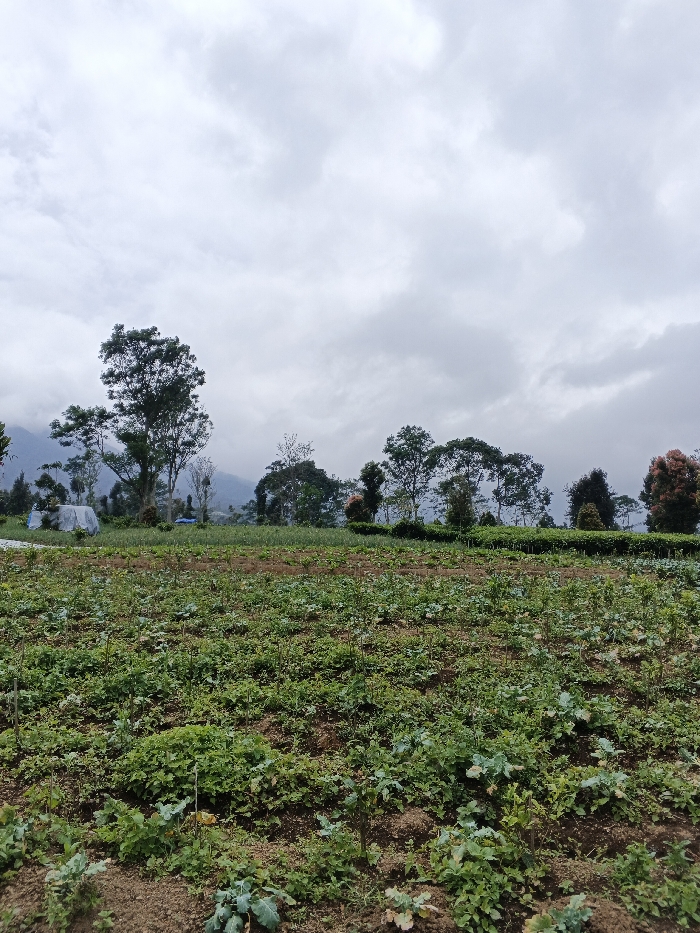 The image displays an agricultural landscape situated in a rural, mountainous region of Unknown, Vietnam, under an overcast sky. The foreground is dominated by a cultivated field with discernible rows of low-growing green leafy plants, appearing to be young vegetables, set in dark brown soil. In the midground, a diverse line of trees with dense green foliage acts as a natural division, behind which further cultivated land is visible. To the left midground, a structure covered with white tarpaulin is partially observed. The background features undulating terrain with hazy mountains or large hills partially obscured by atmospheric conditions or low clouds. The sky is completely overcast with light grey cloud cover. No individuals or active subjects are present.