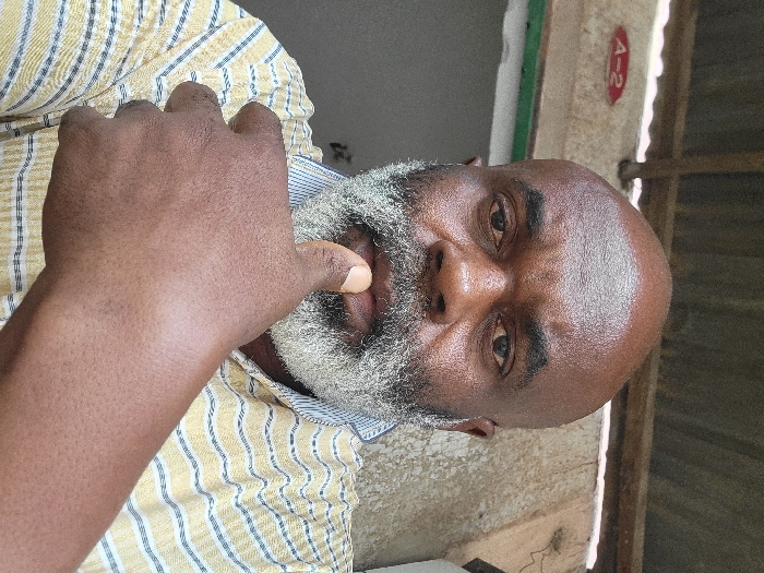 A close-up photograph depicts an adult male of dark complexion, with a bald head and a full, neatly trimmed grey and white beard and mustache
