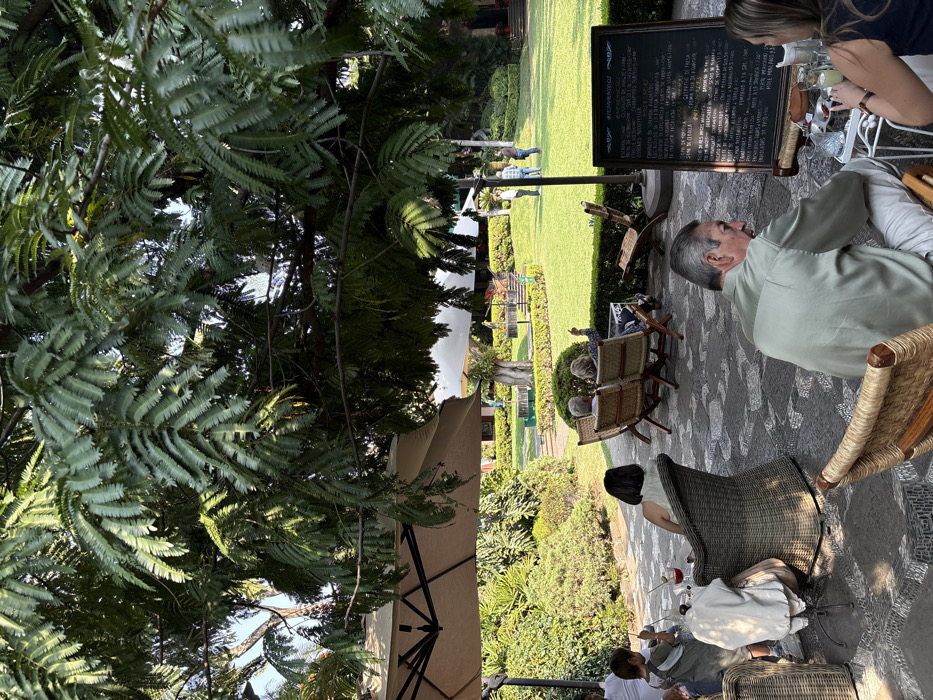 An outdoor dining area is captured in a tilted shot, shaded by an umbrella and a sprawling tree. People are seated at tables, some with a menu board nearby. A well-manicured garden extends into the background with manicured green grass. Some folks are walking. The foreground features wicker chairs and a patterned stone patio.
