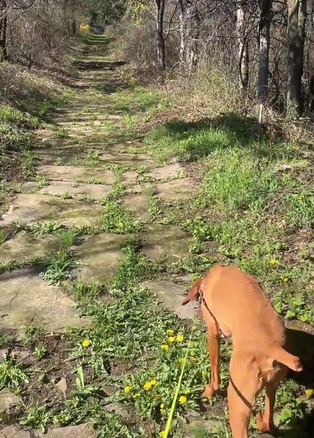 brown dog on a yellow leash walking on a stone path through a wooded area. The path is made of uneven stone slabs with grass and small yellow flowers growing in between. The dog is walking away from the camera, its tail wagging slightly. The trees on either side of the path are mostly bare, with some green undergrowth. The sun is shining, casting shadows on the path.