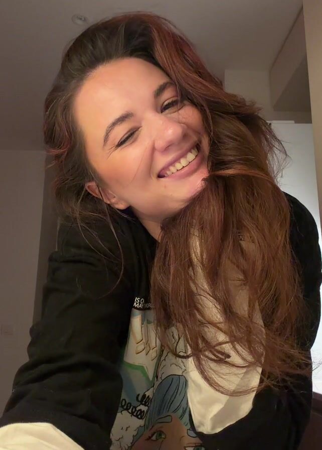 A person with long, wavy brown hair is holding the camera at eye level, facing directly towards the viewer. They are wearing a black long-sleeved shirt with a colorful graphic of anime-style characters on the front. The person smiles broadly at the beginning of the video and then moves the camera around slightly. The background is blurred, but white walls and a light fixture are visible.