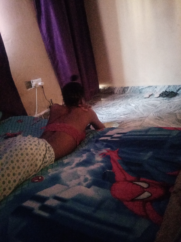 An indoor scene depicts an individual lying prone on a bed or mattress in what appears to be a bedroom, in an unknown city, unknown country. The individual's back is visible, facing away from the camera. They are wearing a red or pink top, possibly a bra, and patterned white pants with dark circular designs. Their dark hair is gathered in a small bun on top of their head. The individual is positioned on a blue blanket featuring a Spider-Man graphic, which is placed over another white patterned sheet. Adjacent to the bed, the floor is light-colored marble or tile with a swirling pattern. A plain, light beige wall is visible, with dark purple curtains hanging on the left side. An electrical outlet with a white plug and black cable is mounted on the wall to the left of the individual. Two pairs of slippers, one light-colored and one dark-colored, rest on the marble floor to the right of the bed. The room is dimly lit. No interactions are observed.