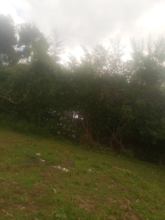 The image displays an outdoor scene in the city of Unknown, Unknown, featuring a grassy slope, dense vegetation, and an overcast sky. The foreground comprises an unmaintained grassy slope with exposed soil patches. Scattered debris on this slope includes a black plastic item, white refuse fragments, and a small white spherical object. The midground is dominated by a dense wall of dark green trees and bushes, which traverses the frame horizontally. A less dense section within this foliage reveals light-colored blossoms, likely white or light purple, centered in the image. A tree trunk is partially visible behind the foliage to the right of the blossoms, and dry, thorny branches extend from the vegetation towards the slope. The background is a bright, heavily overcast sky, appearing white to light gray. Faint horizontal lines, consistent with utility wires, are discernible against the sky in the upper left and center sections. No individuals are present, and no actions or interactions are depicted.