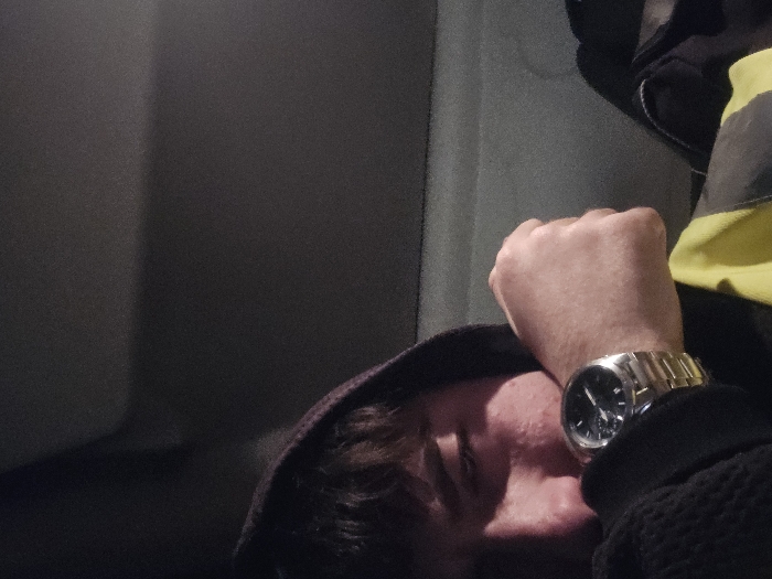A male individual is depicted in a close-up, angled view, observed from the mid-chest upwards, within an interior space with low illumination. The subject has dark brown hair, partially covered by a dark, possibly black, hooded garment exhibiting a textured knit pattern on the visible sleeve. His left hand is raised to his face, resting against his lower right cheek and partially obscuring his mouth. A metallic wristwatch with a silver-colored link bracelet and a dark dial with lighter markers is prominently worn on his left wrist. Below his dark top, a bright yellow garment, consistent with a high-visibility safety vest or jacket, is visible across his left shoulder and upper chest. A dark strap or bag component is partially visible on his right side. The individual's eyes are partially closed and directed downwards. The background consists of a dark grey upper plane and a lighter grey, textured lower section featuring a horizontal seam or edge, indicative of an enclosed environment such as a vehicle interior or a room. The location of this scene is identified as Guildford, United Kingdom.