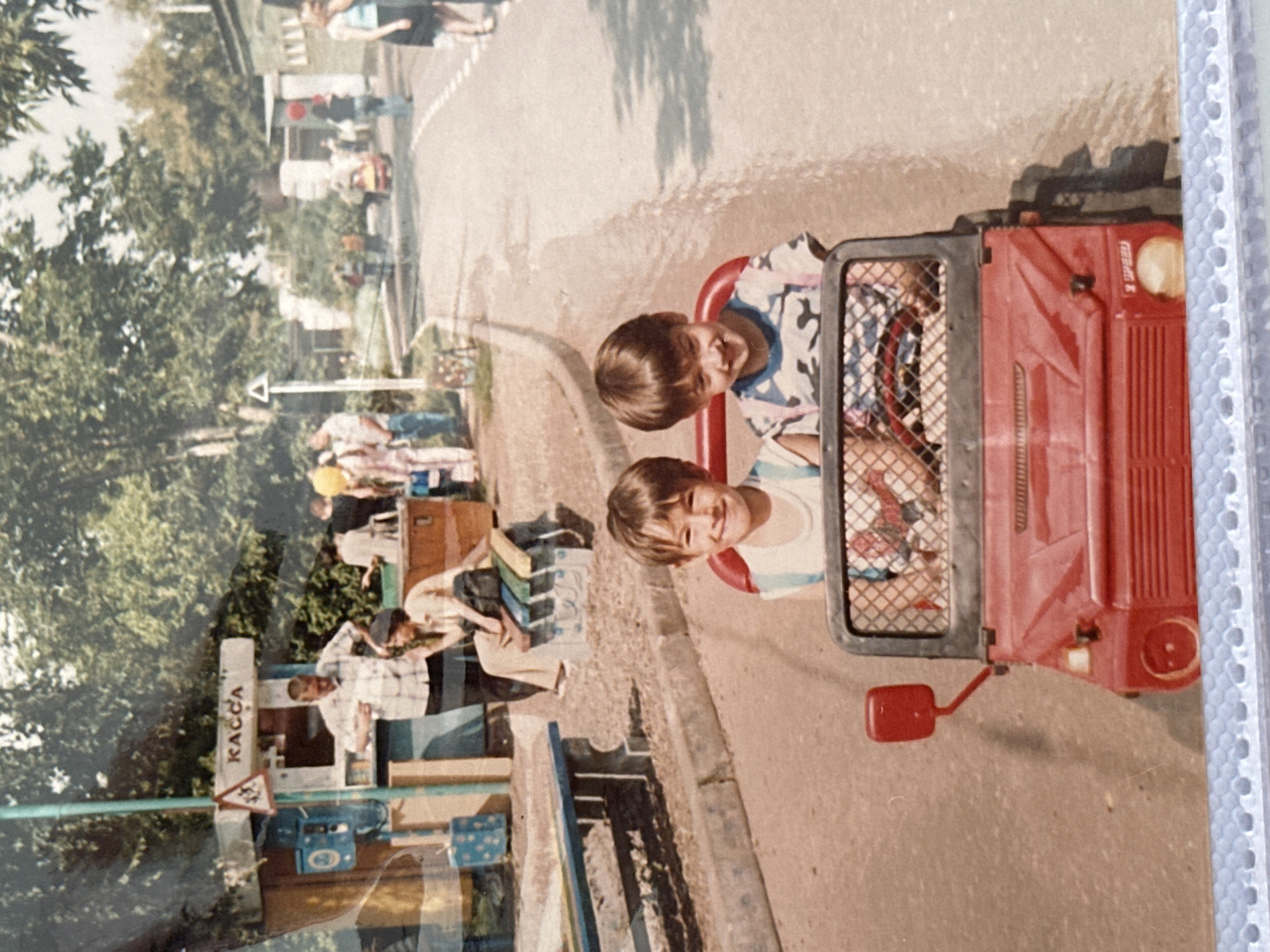 - "Two young boys are in a red pedal car with a metal cage front" by FM-NfWfm2, licensed under CC BY 4.0