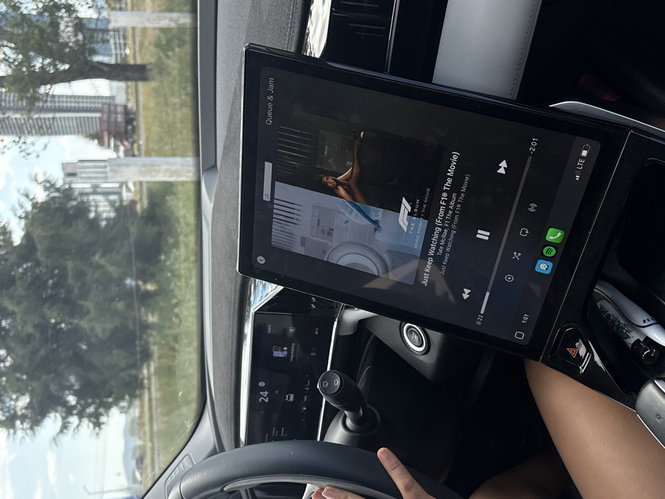 The image depicts the interior of a vehicle, facing forward through the windshield, with a significant portion of the dashboard and central console visible. A person's left hand is partially visible gripping the steering wheel on the left side, and a bare leg is visible in the lower left quadrant. The dashboard features a digital instrument cluster displaying "24°" and other vehicle information. A prominent, vertically oriented touchscreen infotainment system is positioned centrally, displaying a music playback interface for the song "Just Keep Watching (From F1® The Movie)" by Tate McRae. The screen shows album art featuring a person against a textured background. Below the screen, a hazard light button is visible, and in a storage compartment, a white vape pen with green accents is present. Outside the vehicle, a road or highway is visible, separated by a grassy median with scattered vegetation. In the mid-ground, a large conifer tree is prominent. Further in the distance, multiple high-rise buildings and other structures indicate an urban or developing area. A red truck is discernible on the road in the distance, and several concrete pillars stand upright in the background. The sky is clear, suggesting daylight conditions. The scene is located in San Bernardino Tlaxcalancingo, Mexico.