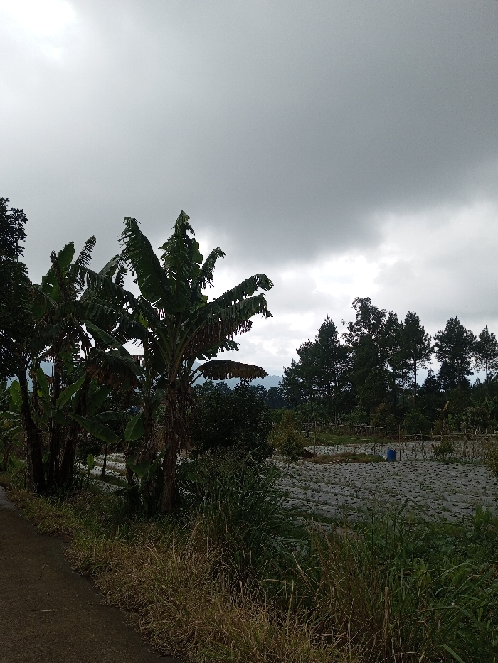 This image depicts an agricultural or rural scene in Kondha, India, under an overcast sky. The foreground on the left shows a segment of a dark-colored road or path, bordered by a strip of dry and green wild grasses. To the right of the path, a cluster of mature banana trees with large, dark green leaves dominates the left-midground, some leaves appearing torn or discolored. Beyond the banana trees, extending into the right-midground, is a cultivated field. The field's ground is covered in a light-colored material, possibly plastic sheeting, laid out in parallel rows, with small plants visible within these rows. A single blue barrel or container is present in the middle of this field. In the background, a dense line of tall, dark green coniferous trees forms a distinct horizon, with distant, hazy hills visible beneath the heavy, uniform grey clouds that fill the upper two-thirds of the frame. No individuals, animals, or specific actions are observed in the scene.